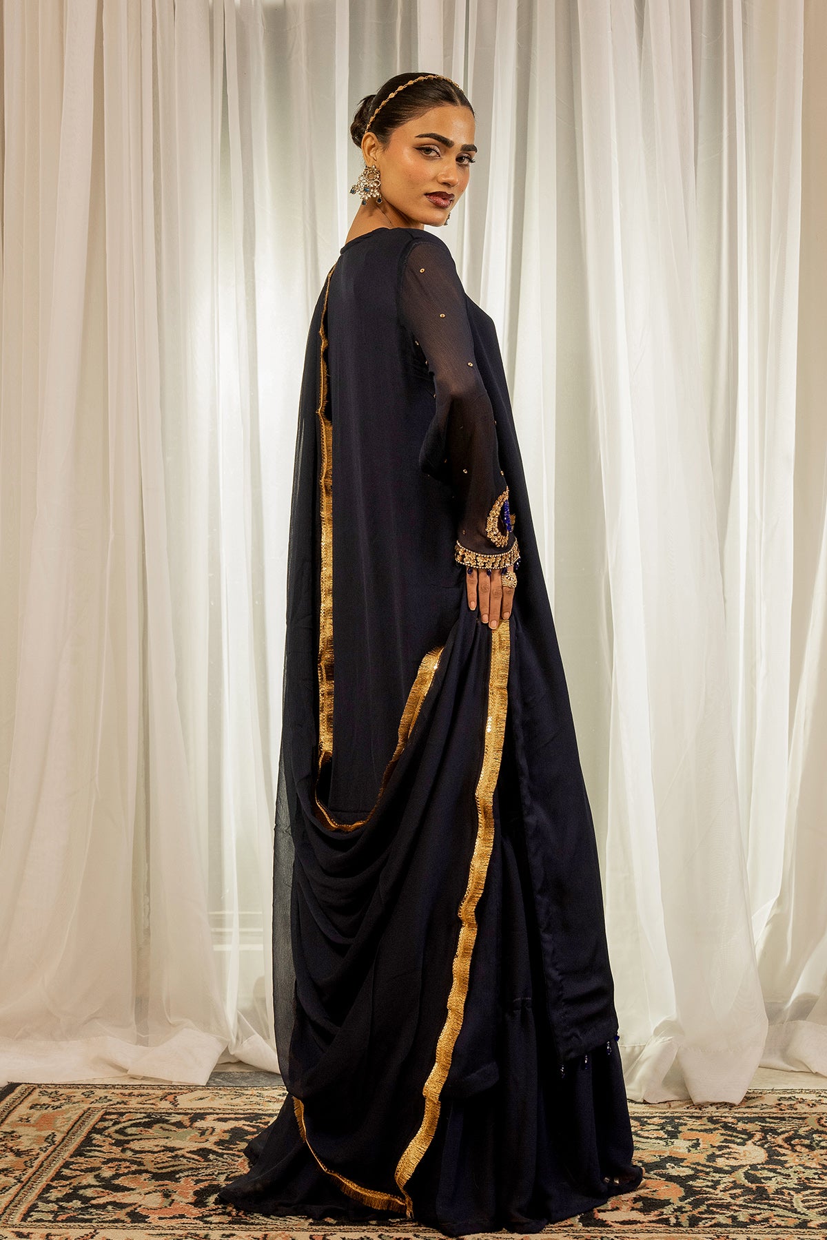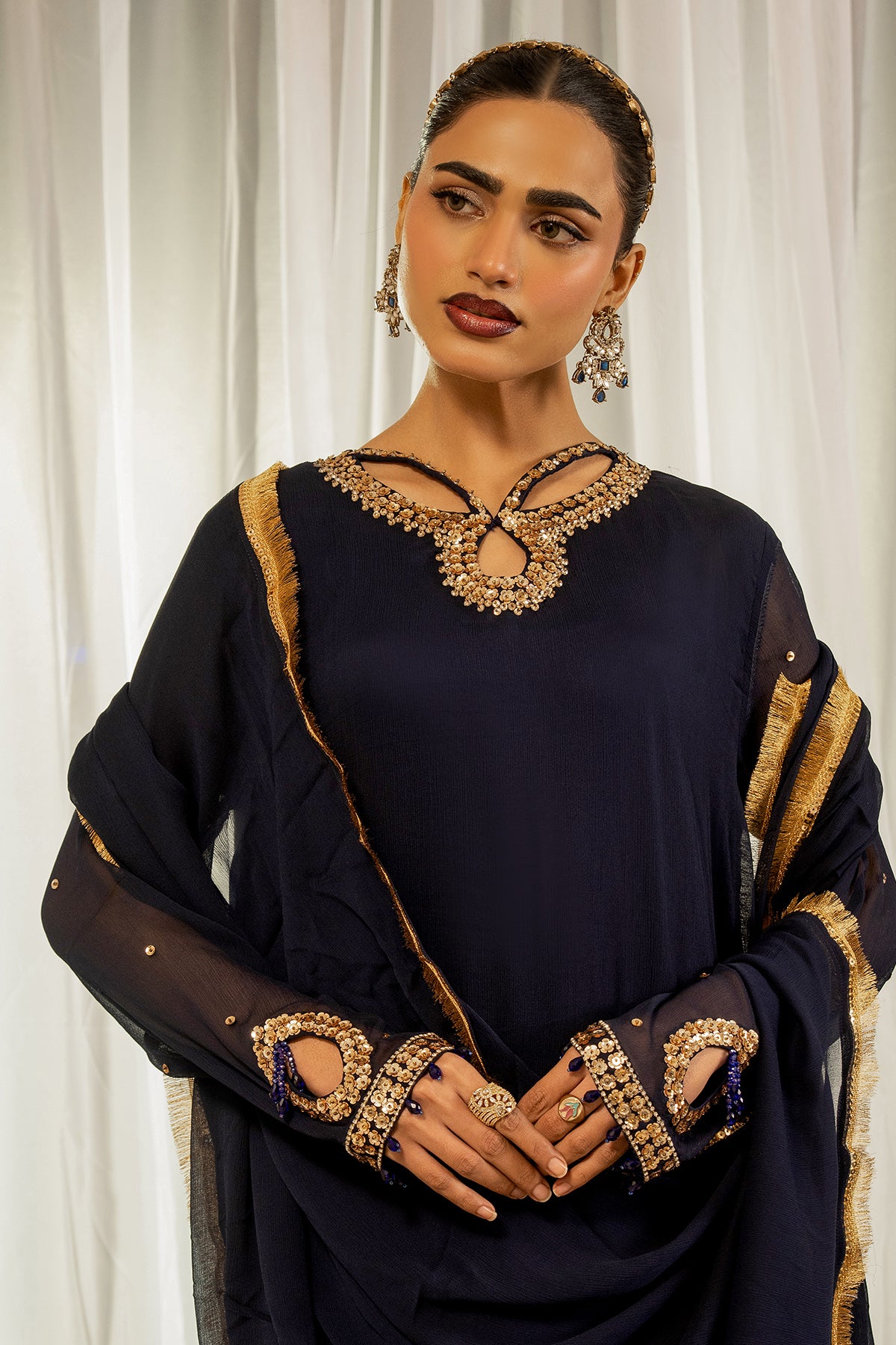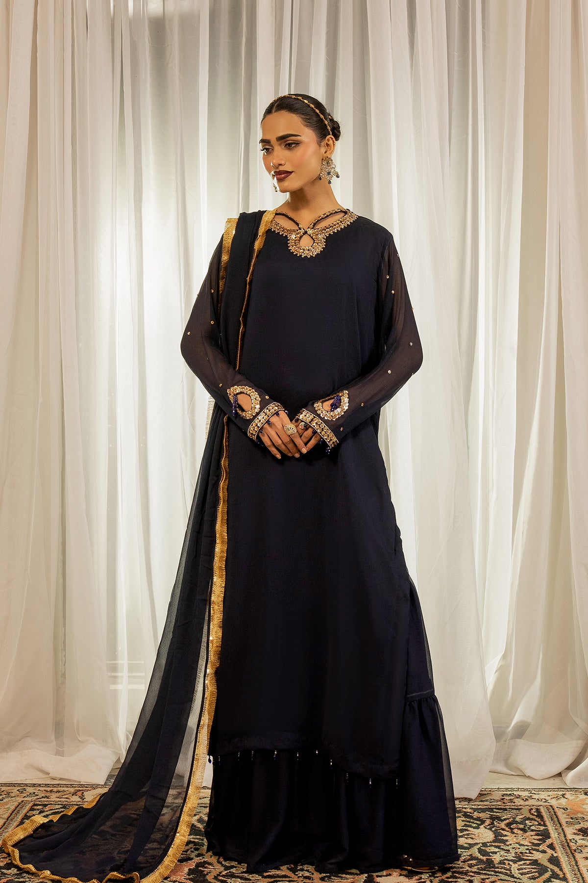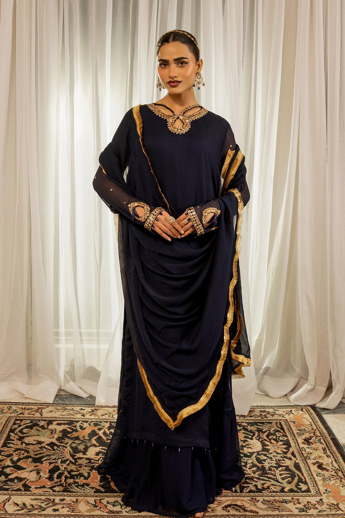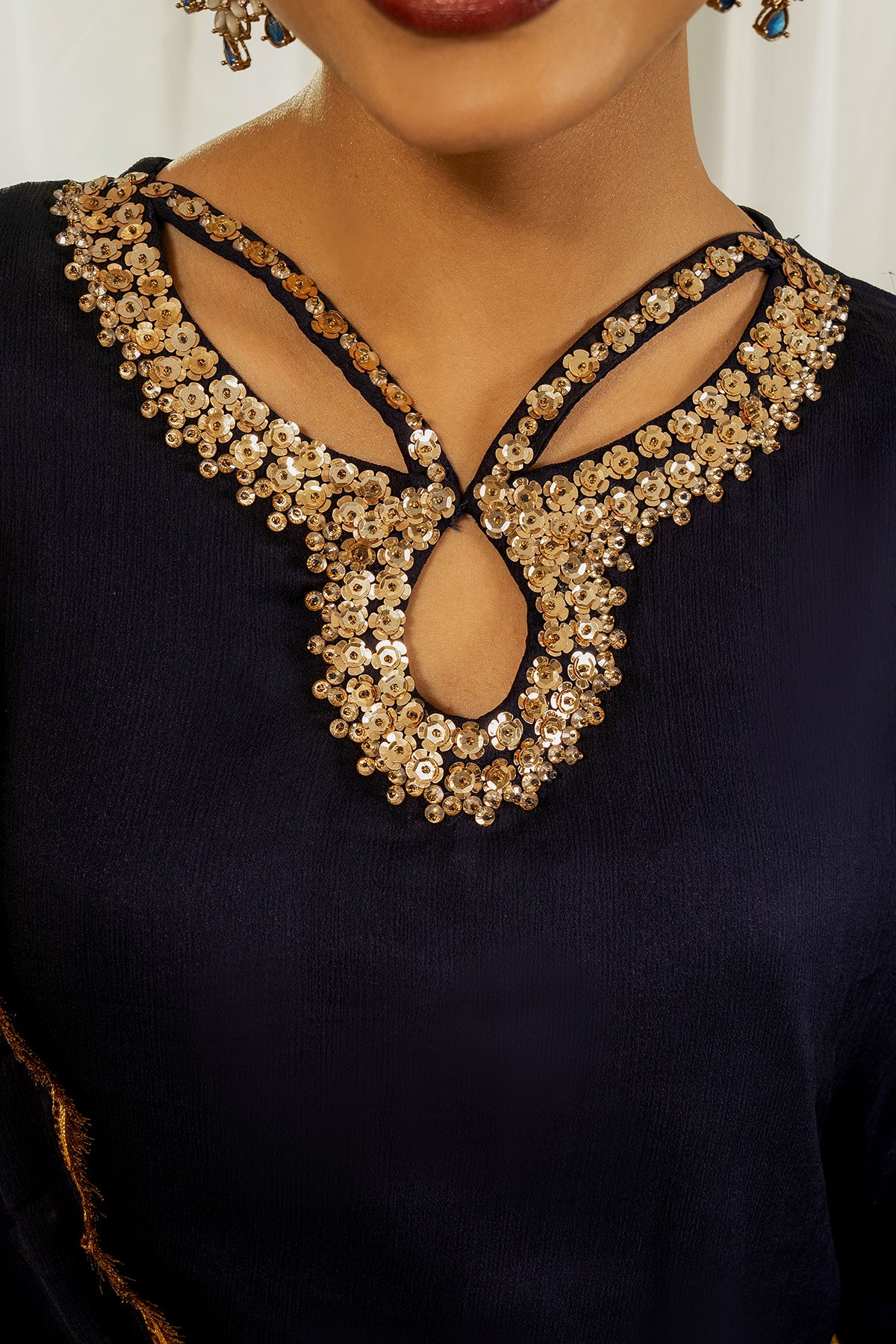 This dress made in soft Georgette chiffon fabric features crew neckline with elongated keylone on the front, Embellinshment along the neckline and sleeves, featuring Garara as bottom