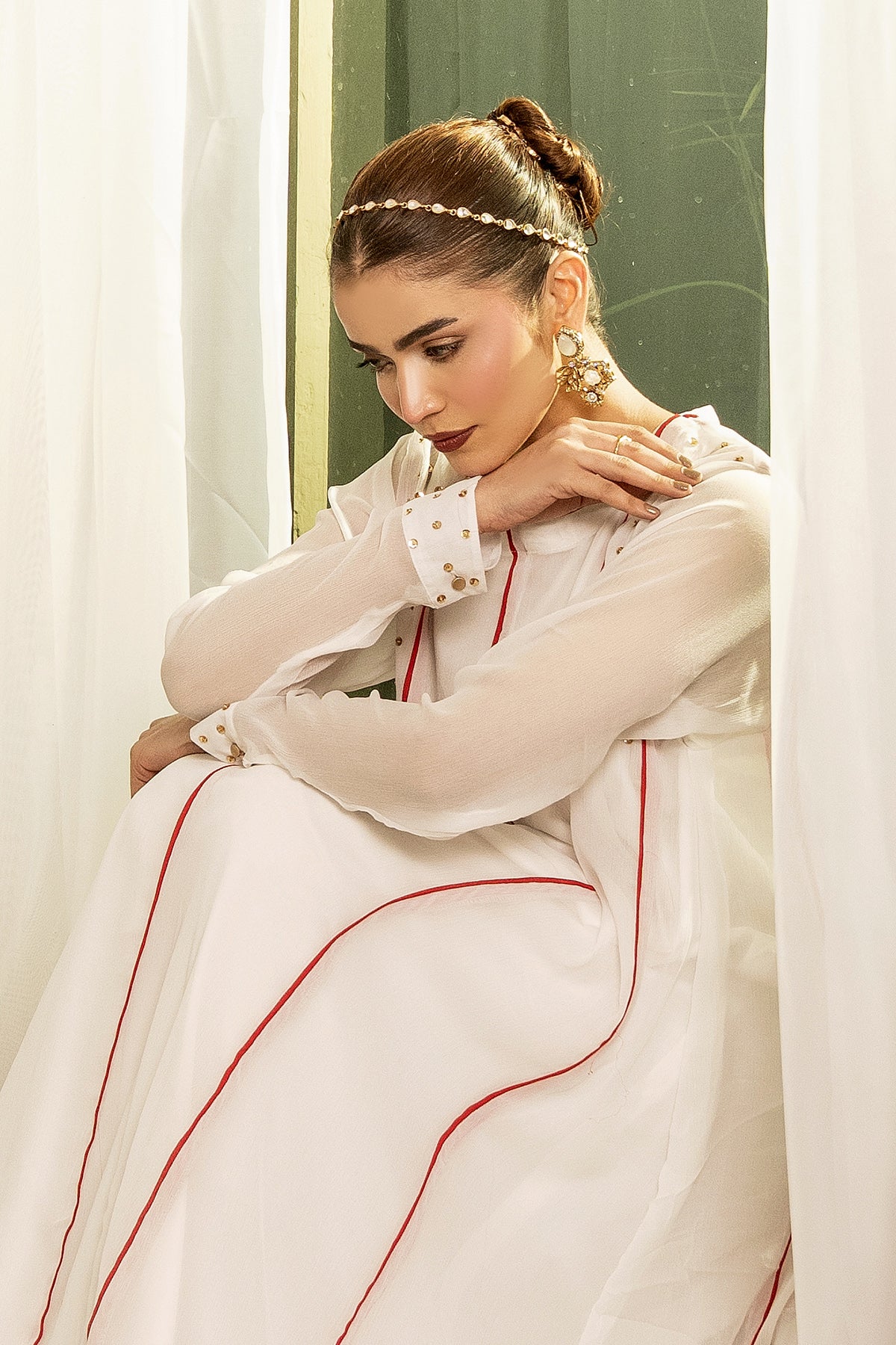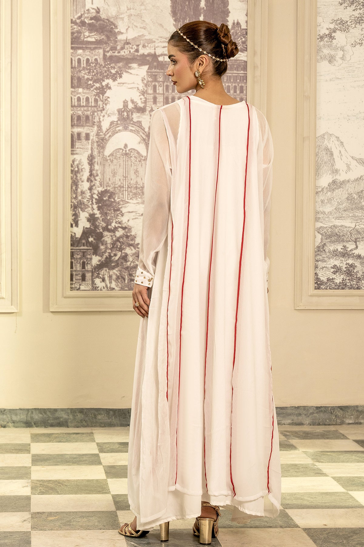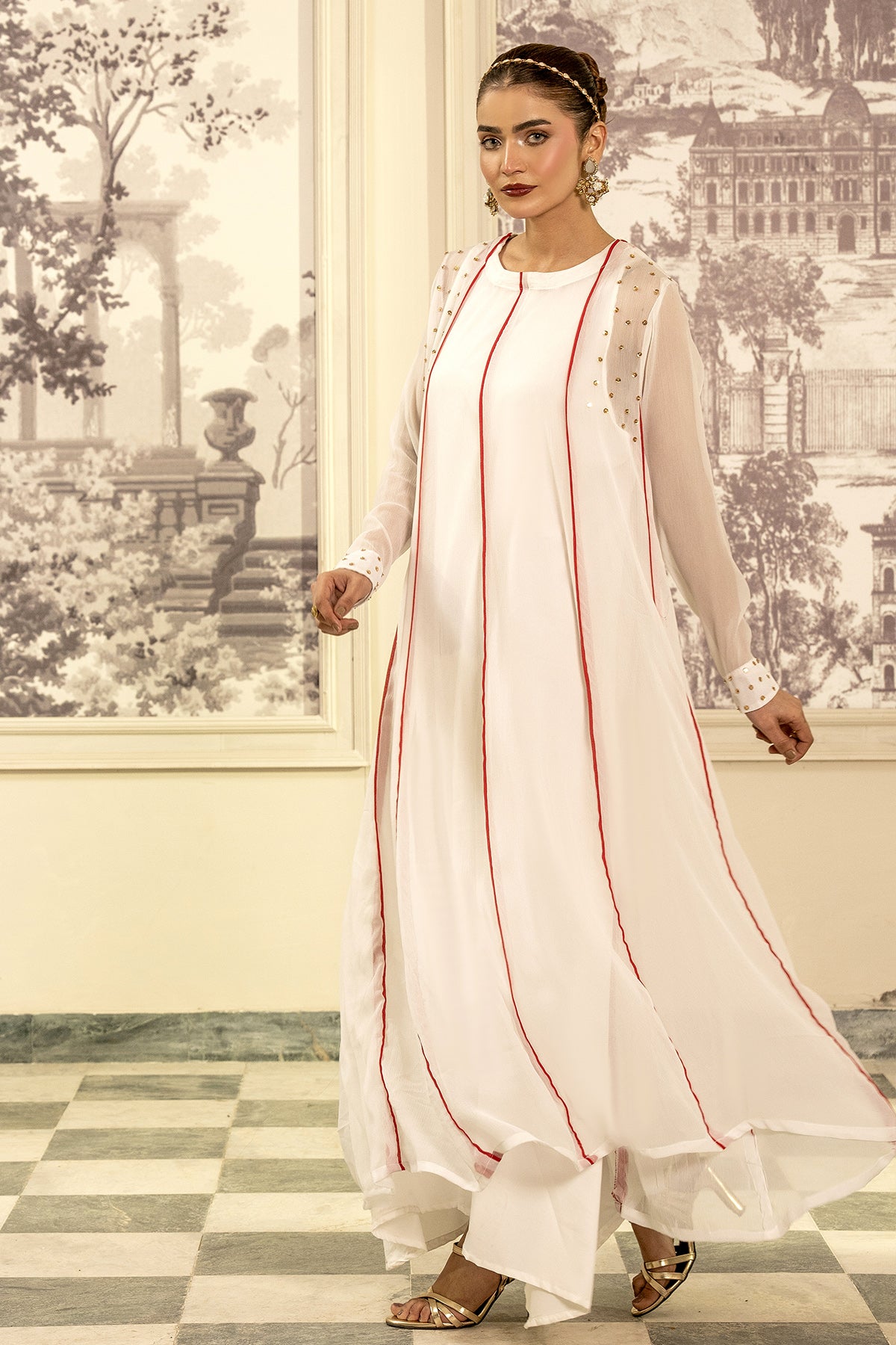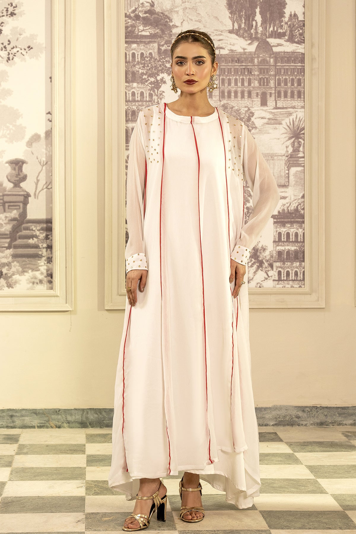 This dress, made in soft gorgette chiffon fabric, Sequence embellishment along the neckline, full length sleeves adorned with sequence embellishment on the sleeve opening.